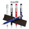 Bolígrafo de metálico de mecanismo pulsador acabado en variada gama de vivos colores. Presentado en estuche individual. Tinta azul.