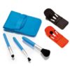 Set de cosmética de 5 accesorios en vivos colores. Incluye brocha con compartimento transparente integrado en cuerpo y 4 aplicadores.