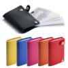 Tarjetero con cuerpo en suave acabado en polipiel de llamativos colores y cierre de corchete metálico. Con tachuelas de refuerzo metálicas en el lomo y 10 compartimentos interiores en resistente PVC transparente.